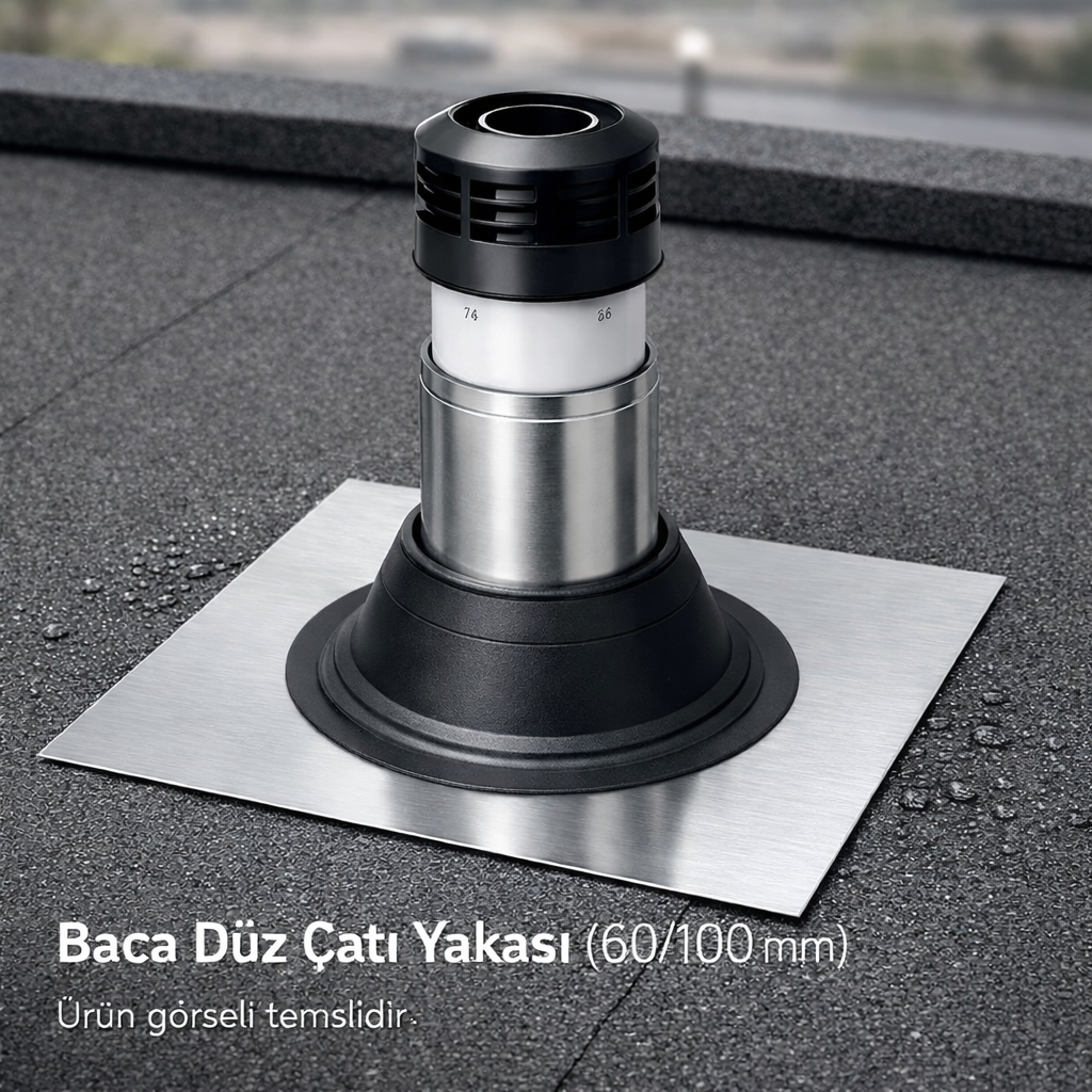 Dayanıklı malzeme yapısı sayesinde yağmur, kar ve rüzgâr gibi zorlu hava koşullarına karşı uzun süreli koruma sağlar. 60/100 mm ölçüsündeki baca ve tesisat sistemleriyle tam uyumlu olan ürün, montaj sırasında pratiklik sunarak işçilik süresini kısaltır. Düz çatı uygulamalarına özel tasarımı, çatı yüzeyinde düzgün ve estetik bir görünüm elde edilmesine yardımcı olur.